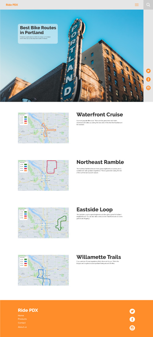 When designing this they wanted a clean and easy to use interface, that highlighted social media and not in your face about selling anything. With that in mind I focused on what things they could offer the public, which were what type of events that involved bikes were going on and what were the best bike routes portland could offer.